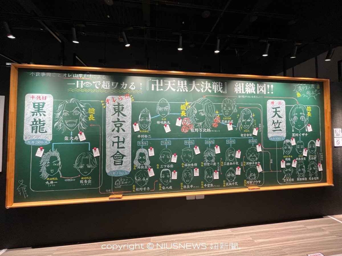 相信《東京卍復仇者》錯綜復雜的角色關係,起初也讓不少讀者們一個頭兩個大,分不清幾人的情感糾葛。而本次展覽也驚喜展示武道朋友山岸的黑板解說,除在黑板上的精緻作畫令人驚艷之外,超級詳細的組織角色解說也瞬間喚醒大家的記憶。