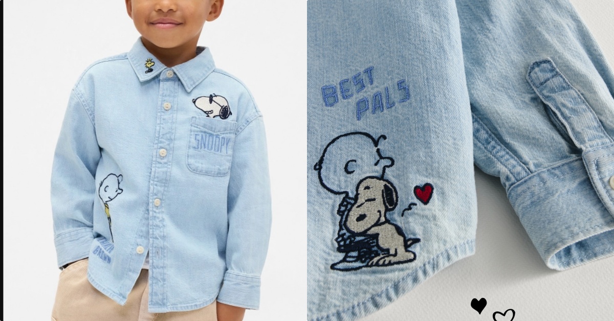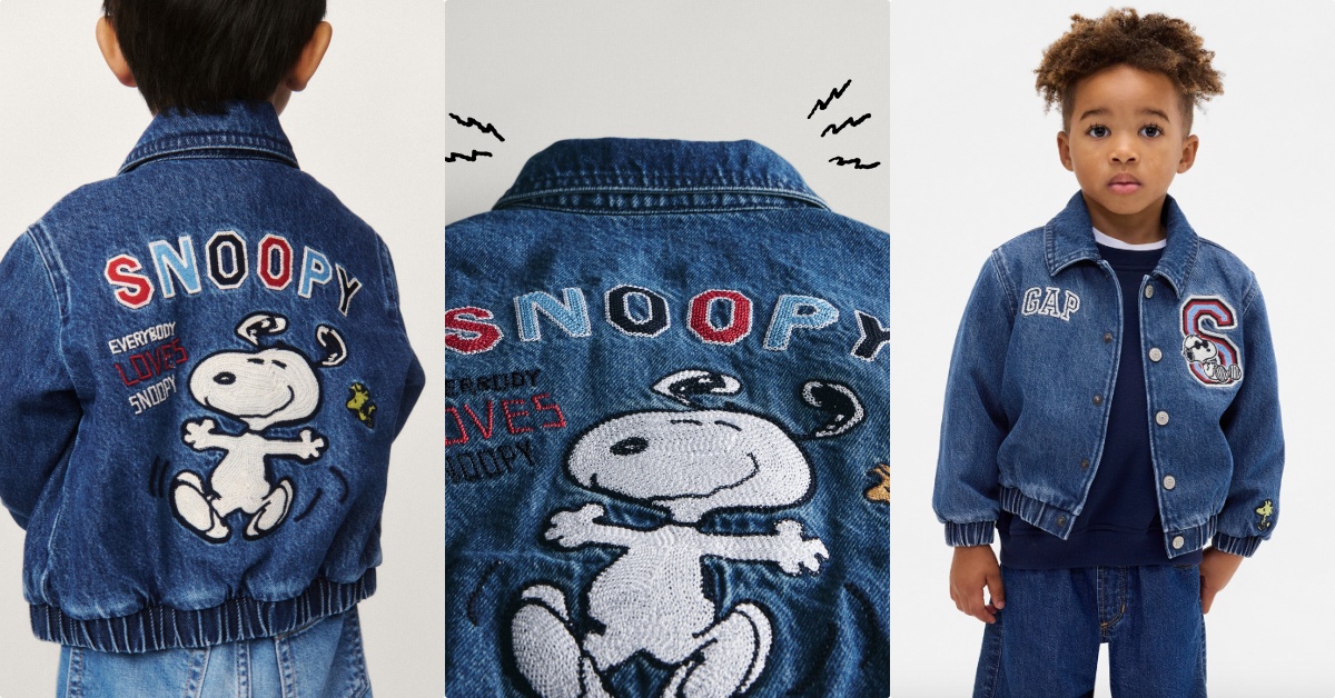 休閒中帶點俐落感的「丹寧童裝」也是這次聯名的一大重點!聯名翻領長袖牛仔襯衫,不只在下擺有史努比緊緊抱住查理布朗的身影,又分身變成戴墨鏡的「酷哥喬」從口袋探出頭來,另一款棒球外套版型的牛仔外套,背後則藏著繽紛大彩蛋,還有一件女寶專屬的「愛心版本史努比」丹寧褲。