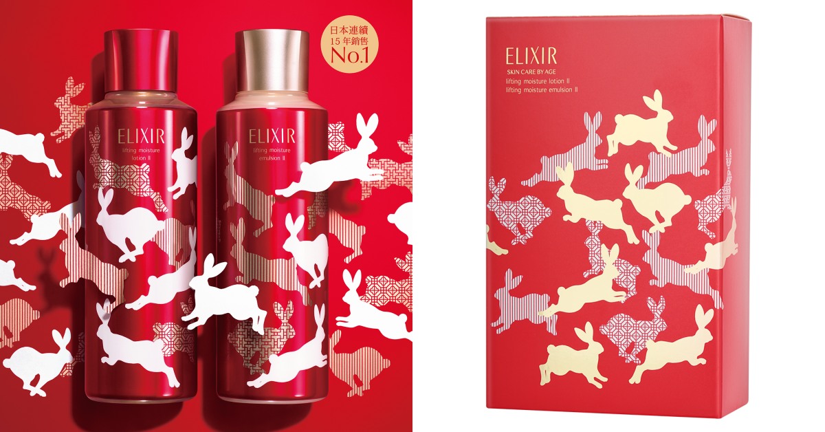 ELIXIR怡麗絲爾的明星商品「彈潤保濕水」和「彈潤保濕乳」,從2020開始每逢新年都會推出限定版包裝,2023搭著兔年,以具有象徵「跳躍」、「更上一層樓」的兔子意象,結合紅、白、金色與「蜀江紋様」、「卍字紋様」的吉祥圖騰推出限定組合。