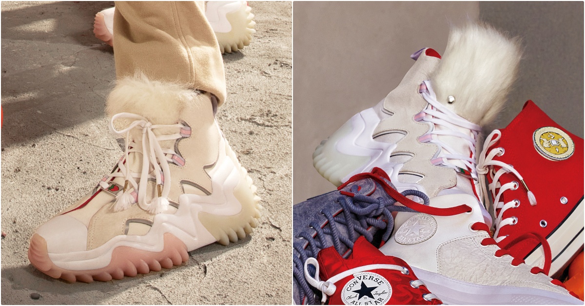 CONVERSE波浪鋸齒厚底鞋以奶油白打造鞋身、加上煙霧紫粉配色,鞋舌上端添加的可拆卸毛絨感裝飾混搭銀色反光材質,鞋帶處還可以找到「一根胡蘿蔔」,實在太犯規了!!!