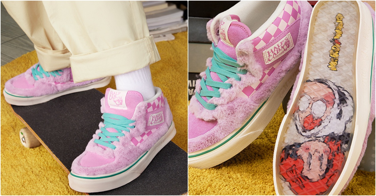 VANS在兔年與玩具IP形象Miro & Wujo 聯手,打造出兔年限定Half Cab鞋款,鞋面上炸出粉色絨毛,招牌棋盤格紋也用白、粉配色,鞋底採用半透明的果凍感設計,裡面可以發現人氣角色的身影